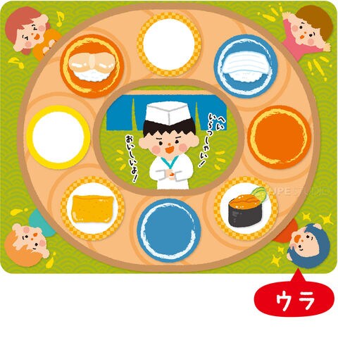ウラ面…作ったおすしをお皿に乗せて、回転寿司屋さんごっこができます。