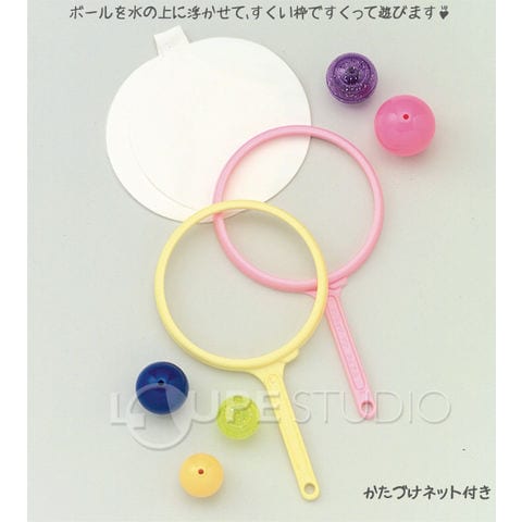 カラフルで大小さまざまなボールを水に浮かせてすくい枠に専用紙を貼ってすくって遊びます。