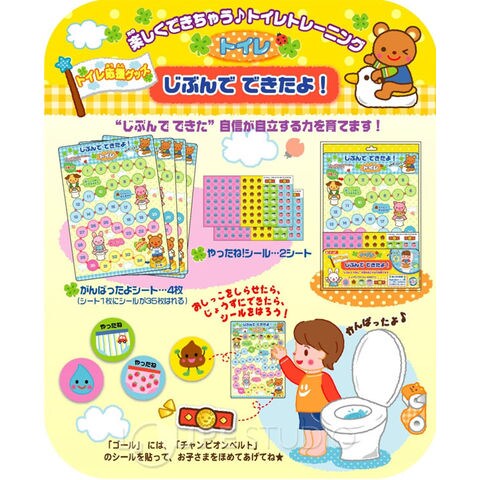 生活の中で自分の意志でトイレに行く習慣を身に着けるまでにはけっこう根気のいる作業なんです。この「じぶんでできたよ!(トイレ)」を使えばお子様もトイレに行く事が楽しくなるような環境を作れる楽しい商品です。