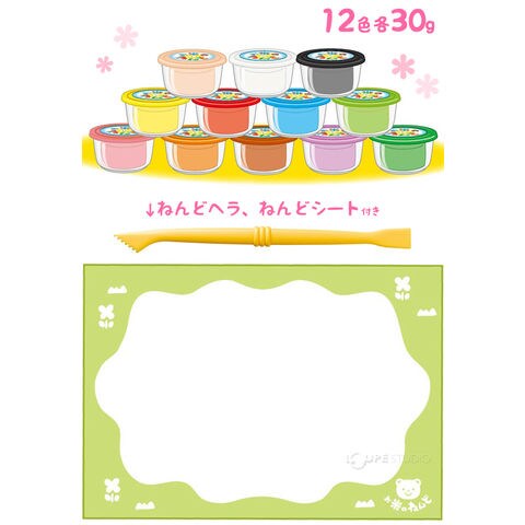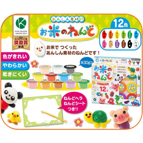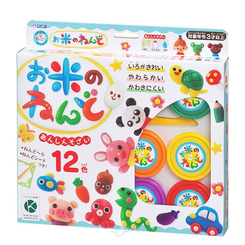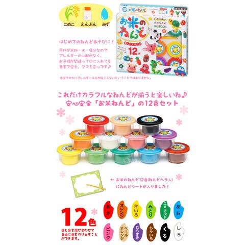 | 内容物 | お米のねんど30g×12色 (赤・黄色・ オレンジ・緑・エメラルド・青・ピンク・ペールオレンジ・紫・ 茶色・黒・白) ねんどヘラ、ねんどシート(サイズ:295mm×420mm) |