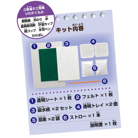 | 材質 | フェルト/ポリエステル、吸水紙/紙、尿素/尿素 透明トレイ・透明シート/PET、ストロー/PP 説明書/紙 |