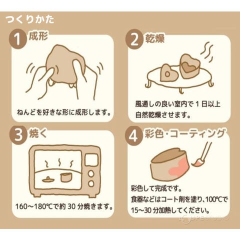 | 材質 | オーブンねんど(白)/カオリン・PE・防腐剤・水 オーブンねんど(茶)/蛙目粘土・PE・防腐剤・水 コート剤/アクリル樹脂・防腐剤・水 説明書/紙 |