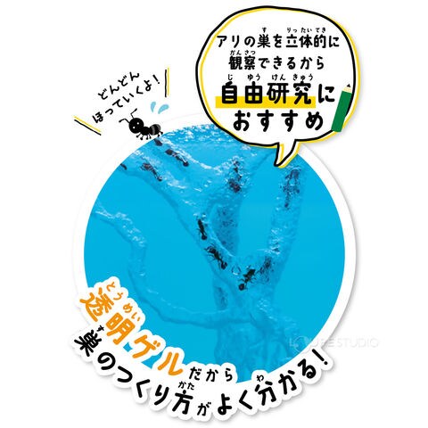 「アリゲルの素」と水を合わせて電子レンジにかけることで、簡単に不思議なゲルが完成します。公園などでアリを採集し、3D空間に広がる不思議な巣の世界を楽しみましょう!お子さまの自由研究にも最適です!