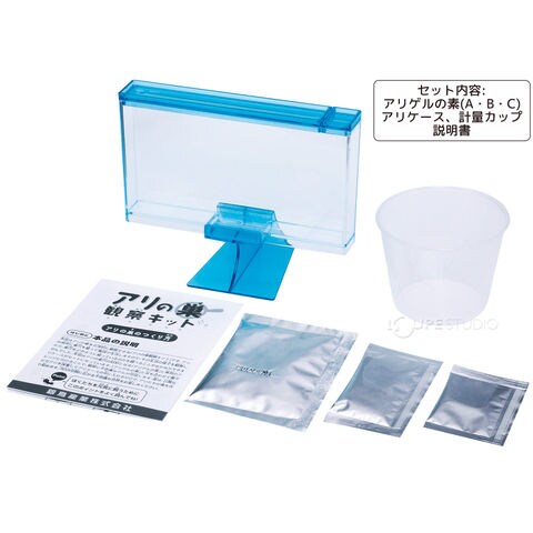 本品はアリの巣穴の材料となる「アリゲルの素」と専用の容器がセットになっています。この一式で夏休みの自由研究にチャレンジしてみよう♪