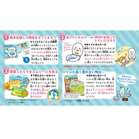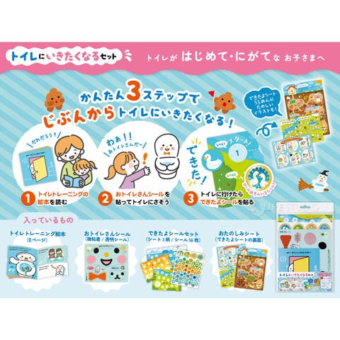 | セット内容 | トイレトレーニング絵本/おトイレさんシール/できたよシールセット/おたのしみシート(できたよシートの裏面) |