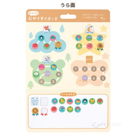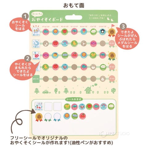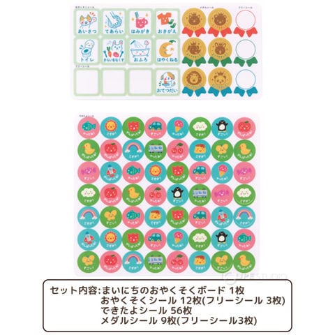 | セット内容 | まいにちのおやくそくボード 1枚 おやくそくシール 12枚 (フリーシール 3枚) できたよシール 56枚 メダルシール 9枚 (フリーシール3枚) |