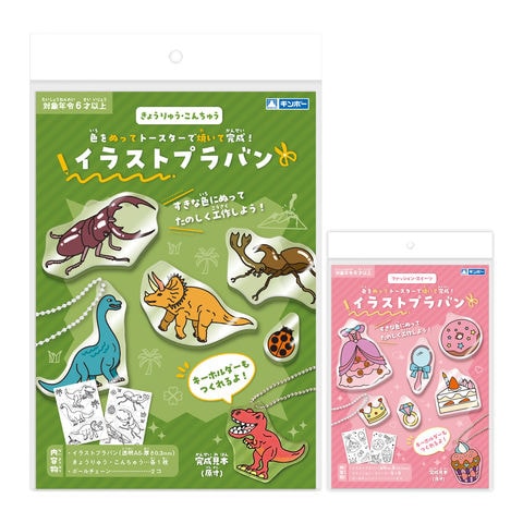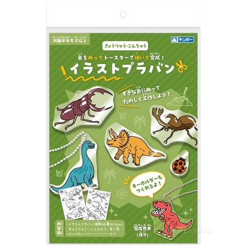プラバンにイラストが印刷されているので、好きな色をぬってトースターで焼くだけで完成します!自分だけの恐竜や昆虫のストラップが作れるセットです。