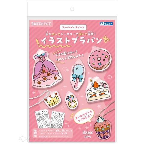 プラバンにイラストが印刷されているので、好きな色をぬってトースターで焼くだけで完成します!自分だけのドレスやスイーツのストラップが作れるセットです。