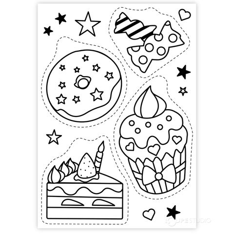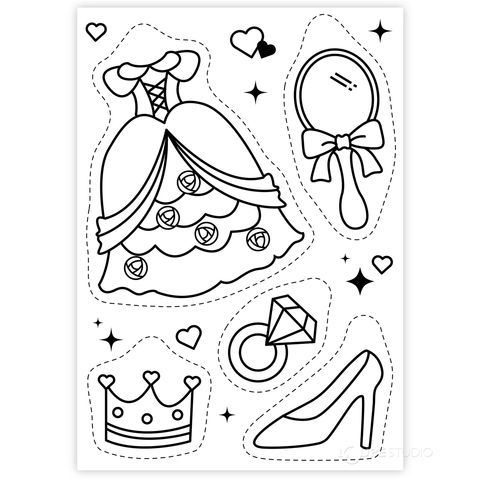 イラストの内容は、可愛らしいドレスや指輪、スイーツです。