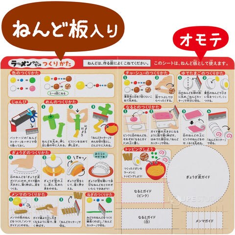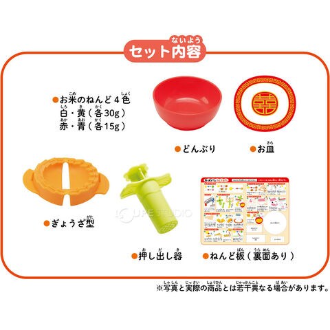 | 材質 | 米粘土/米粉・水・塩分・食用顔料・保存料 ぎょうざ型/PP 押し出し器・どんぶり/ABS ねんど板・お皿/紙 |
