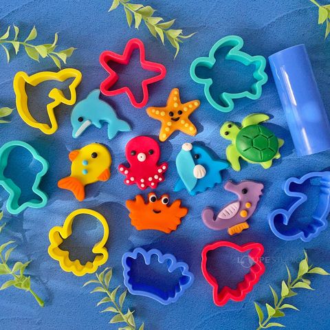 8種類の「うみのいきもの」のねんどぬき型とローラーのセットです。