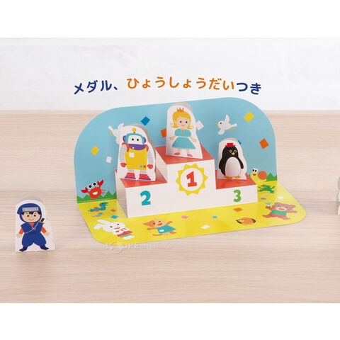 - 表彰台、メダル(紙製)が付いているので、遊びが盛り上がります!