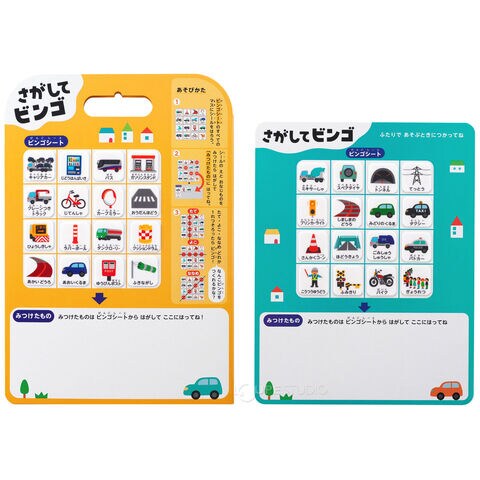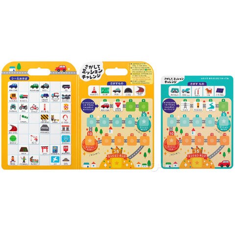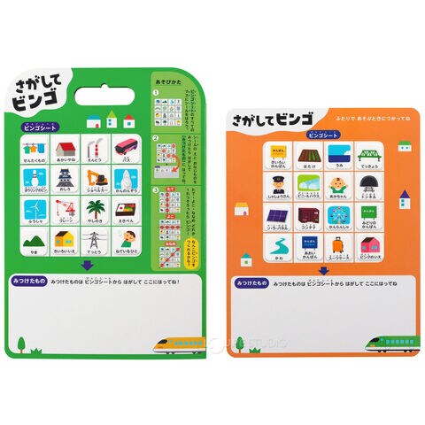 「田んぼ」「川」「看板」など、48枚の「さがすものシール」が入っています。車窓から見えるいろいろなものを探していく2種類のゲームで遊べます。