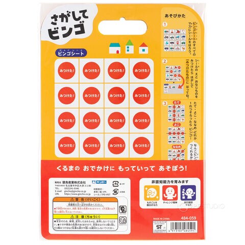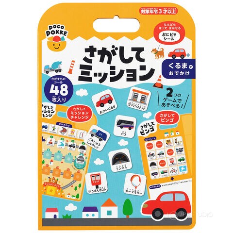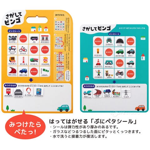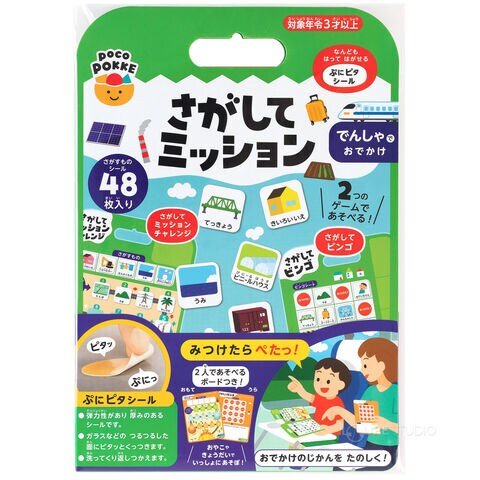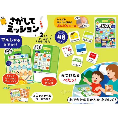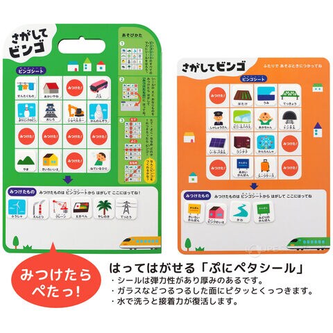 さがしてミッション シール遊び 絵本 はってはがせる 子供 こども キッズ ぺったん でんしゃでおでかけ くるまでおでかけ 移動時間 ビンゴゲームスペック