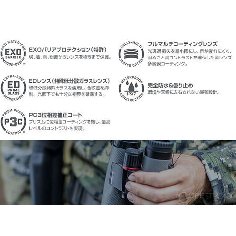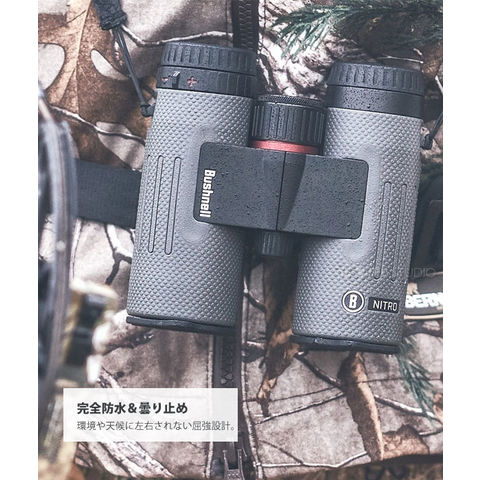 EDレンズ(特殊低分散ガラスレンズ)採用。特許取得EXOバリアプロテクションにより傷、水、汚れから極限までレンズを保護。PC3位相差補正コート。300gを切る10×25から見かけ視界65°広角10×36がラインアップ、ニトロ(NITRO)。