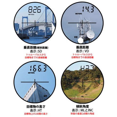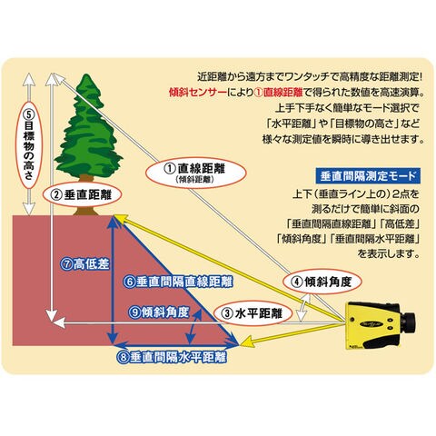 | 測定モード | 直線距離(傾斜距離)、水平距離、垂直距離、傾斜角度、目標物の高さ |