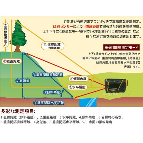 | 測定モード | 直線距離(傾斜距離)、水平距離、垂直距離、傾斜角度、目標物の高さ |