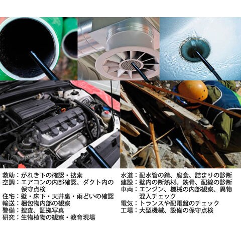 | カメラヘッド | 完全防水IP68、先端部直径9mm、高輝度白色LED(5段階明度調整) |