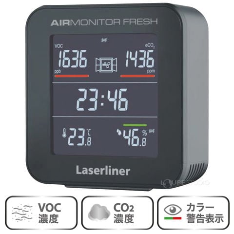 | 機能 | VOCアラーム(400ppb以上)、eCO2アラーム(1000ppm以上)、湿度アラーム(30%以下、65%以上)、 インジケーター、時計 |