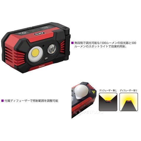 照度は無段階に調整でき、ディフューザーにより広角投光器をさらに周辺全体、広範囲に照らすことが可能。