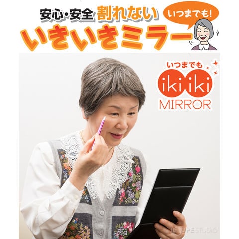 ご高齢になると「病気」や「外出の機会がない」などの理由からお化粧をやめてしまい、お化粧をしないことで、さらに外出しなくなり友人と会う機会も減り、外出や友人と会う頻度が少なくなると重度要介護になる確率が増加するとも言われています。お化粧をすると、気持ちが引き締まり、また楽しい気分になるので、人に会うときに自信が持てたりするなどの気持ちの変化が起こります。お化粧は脳へ良い刺激を与えるだけでなく、手指や腕、身体を動かすため、とても良い運動となり、心・脳・身体に良い効果をもたらし、ADL(日常生活動作)の維持・向上が高まり、結果としてQOL(Quality of Life)に高まることが実証されています。そこで当社、堀内鏡工業株式会社は、高齢者や介護を受ける方に、いつまでもお化粧を楽しんで頂きたいと思い、ペット樹脂を使った割れないミラーで、本格的な化粧用鏡を製造開発いたしました。この「いきいきミラー」なら、机の上から落としたり、手から滑り落ちたりしても鏡が割れる心配がありませんので、どなたにも安心してお使い頂けます。