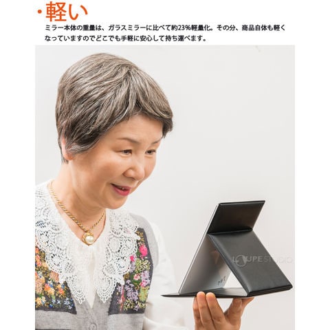 - ミラー本体の重量は、ガラスミラーに比べて約23%軽量化。 その分、商品自体も軽くなっていますのでどこでも手軽に安心して持ち運べます!