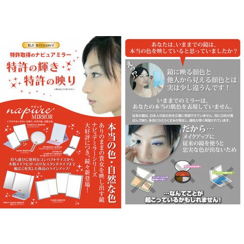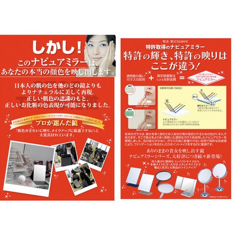 ナピュアミラーは、くすみの原因となる鉄分をより多く取り除いた透明度の高いガラスと、色の再現性が高い反射金属との組合せにより、本来の姿をありのままに映し出す鏡です。肌の色がより鮮明に映ることで、自分にあったファンデーションの色味がわかり、メイクの仕上がりが各段によくなるため、美容業界のプロの方々にも支持されています。