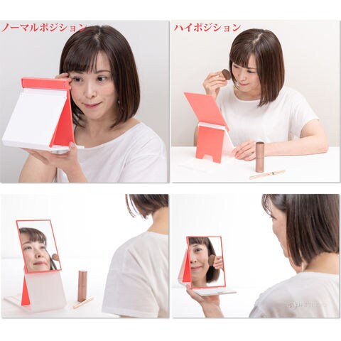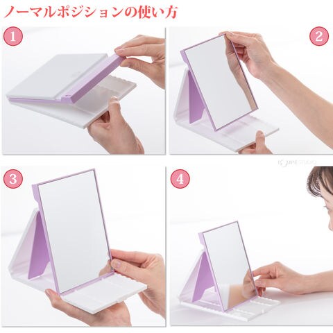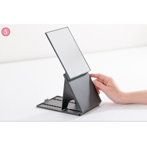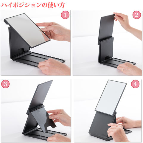 フタを開いてミラー部分を起こしてマグネットで固定し、スタンドをお好みの10段階、角度調節ストッパーでミラーを止めてご使用ください。