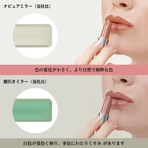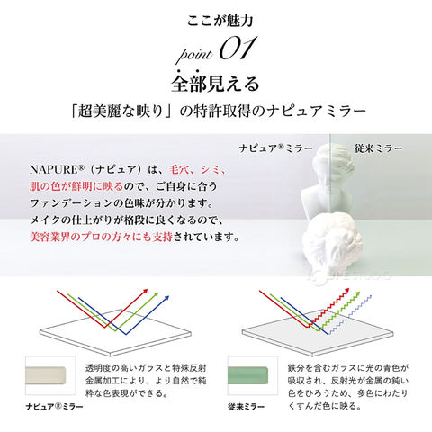 NAPURE(ナピュア)は、自然で純粹な色を映すことができる、特許取得の鏡(ナピュアミラー)を使用した、ミラ一コレクションです。ナピュアミラ一は、くすみの原因となる鉄分をより多く取り除いた透明度の高いガラスと、色の再現性が高い反射金属との組合せにより、本来の姿をありのままに映し出す鏡です。肌の色がより鮮明に映ることで、自分にあったファンデーションの色味がわかり、メイクの仕上がりが格段によくなるため、美容業界のプロの方々にも支持されています。