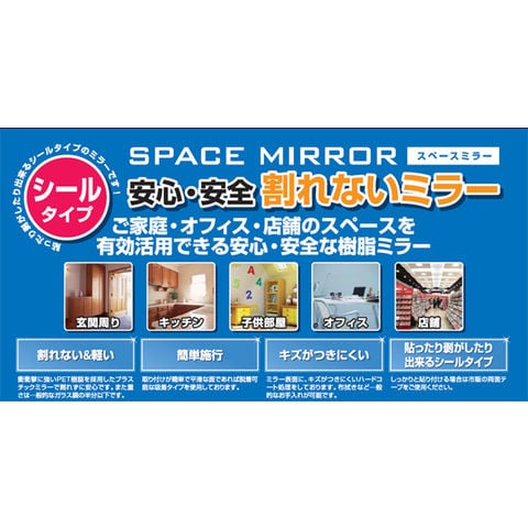 安心・安全 フィルム・シールタイプの割れない鏡スペース・ミラー。貼ったりはがしたり自由自在。樹脂でできた貼り付けタイプで、オフィス、ご家庭・お店のスペースを有効活用!