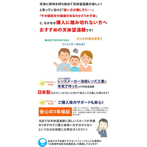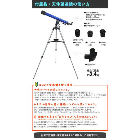 | 商品サイズ | 鏡筒:70cm(接眼レンズ含まず) 三脚:90cm(収納時) 83cm~130cm(組立時) |