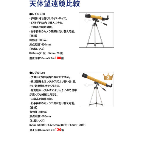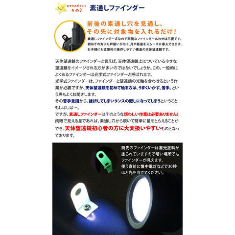 | その他付属品 | 天頂ミラー 2段タイプ三脚(83cm~130cm) アクセサリートレイ オリジナル天体ガイドブック スマホアダプター【スマホ横幅サイズ:55~98mmまで対応】 | |