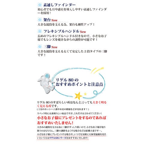 天体望遠鏡 スマホ 撮影 初心者 リゲル80 日本製 80mm 天体望遠鏡セット 望遠鏡 天体 子供 小学生 携帯 ブルー 天体ガイドブック付き 子供用に最適 初心者に向け本気で作られた 土星の環 土星食 レモン彗星 屈折式 キャンプ クリスマスプレゼント クリスマススペック