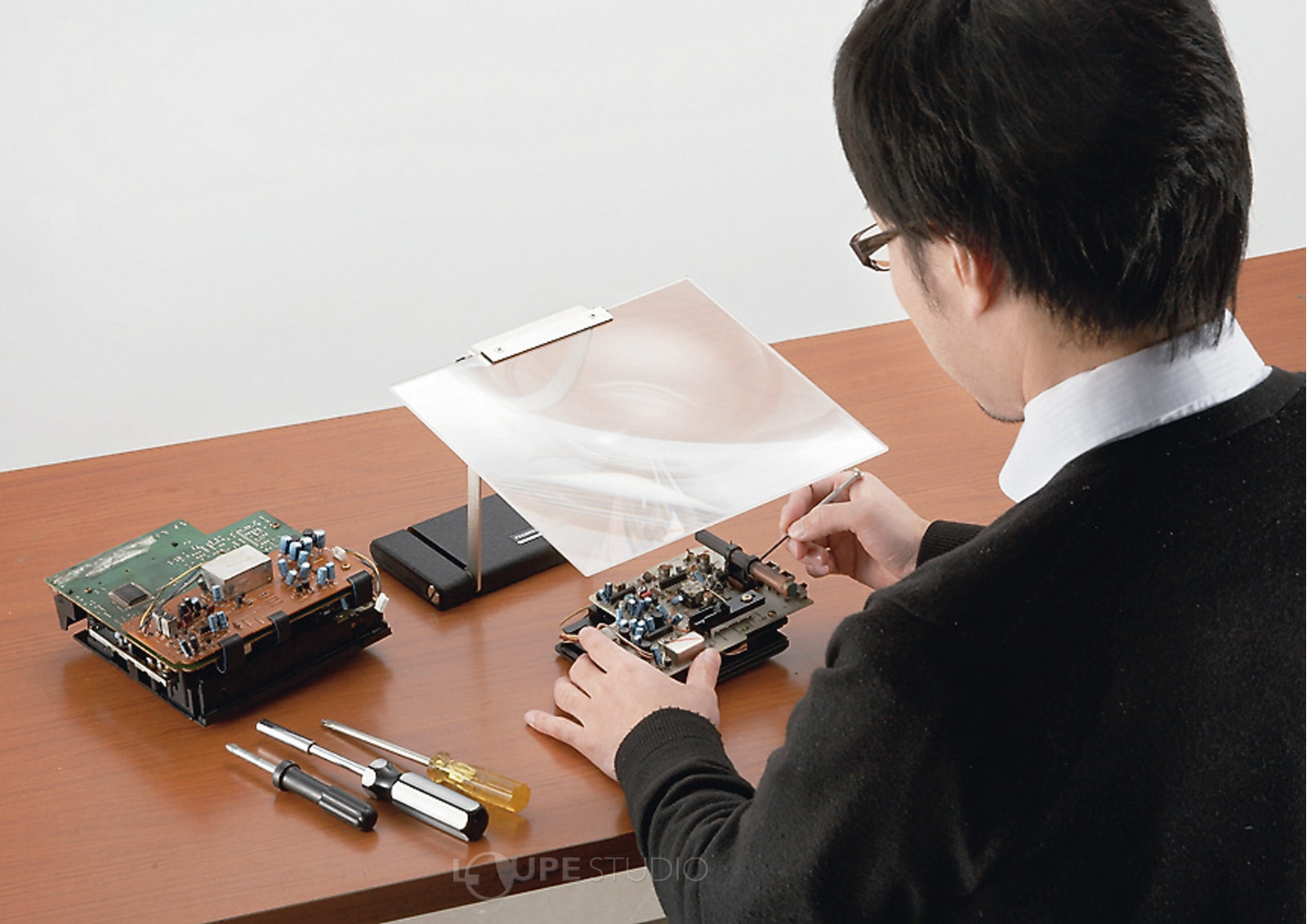 拡大鏡を奥に置いて使うと、広い作業スペースを確保できます。