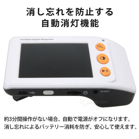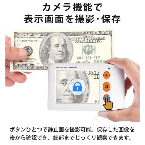 【歪みのないクリアな視界】 従来の虫眼鏡で起こりがちな「周辺部のぼやけ」をデジタル技術で解消。3.5インチのTFT液晶モニタが、隅々まで鮮明な文字を映し出します。【最大25倍の5段階ズーム】 倍率は2倍・4倍・8倍・16倍・25倍の5段階にワンタッチで切り替え可能。新聞の閲覧から、薬のパッケージなどの細かな文字まで幅広く対応します。【選べる8つの表示モード】 使う方の見えやすさに合わせて、フルカラー、白黒、反転表示など8種類のカラーモードを選択可能。視覚障害やロービジョンの方の読書を強力にサポートします。【静止画保存&持ち運び便利】 microSDカード(最大32GB)対応で、気になった情報を静止画として保存可能。重さわずか145gの軽量設計で、外出先でのメニュー確認や買い物にも最適です。【大容量バッテリー内蔵】 1500mAhのリチウム電池を搭載し、フル充電で約3時間以上の連続使用が可能。電池交換の手間がなく、経済的にお使いいただけます。