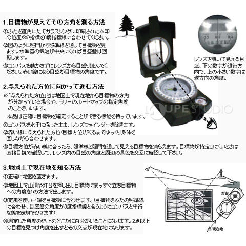 オイル入りでスムーズに北の方角を指し示すコンパスです。レチクルが入っているため、正確に角度測定ができます。レンズをのぞくと、360度刻みの度数目盛を拡大して読み取ることができます。水準器付で三脚に固定し、正確に測定することが可能です。広い覗き窓で撮影のロケハンにも便利!