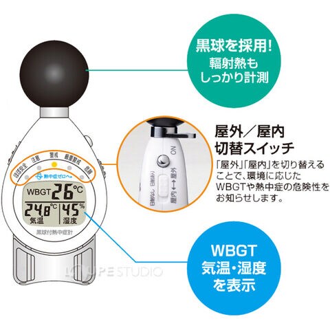 熱中症の危険性を5段階のライトとブザーでお知らせ。気温・湿度に加え、黒球温度(WBGT)も表示します。