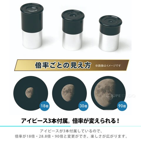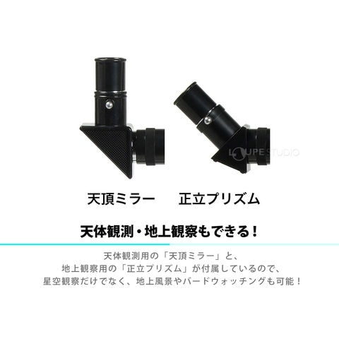 付属品アルミ三脚、アイピース(4mm・12.5mm・20mm)、5×24ファインダー、天体観測用天頂ミラー、地上観察用正立プリズム、スマートフォンアダプター、天体ガイドブック、取扱説明書、星座早見盤
