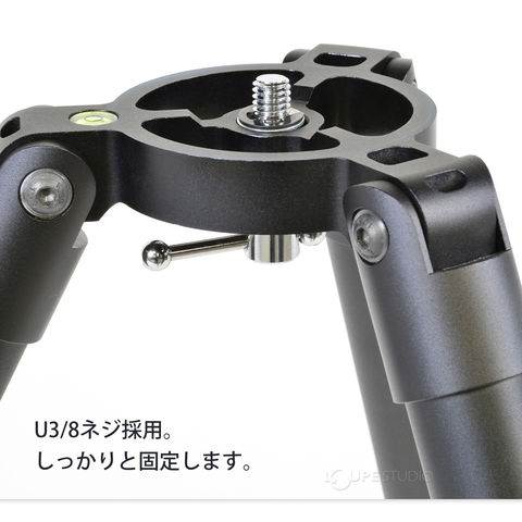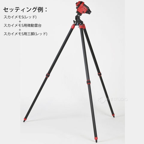 スカイメモS専用三脚。軽量なアルミ製で持ち運びに大変便利です。水準器もついていますので、水平も取りやすく天体撮影に最適です。取付けネジはスカイメモS、スカイメモS用微動マウントに対応のU3/8ネジを使用。安定した固定を実現しています。スカイメモSの本体色に合わせ、ブラック・レッド・シルバーの3色をご用意しました。