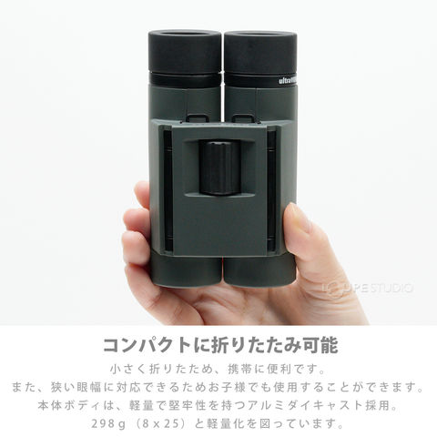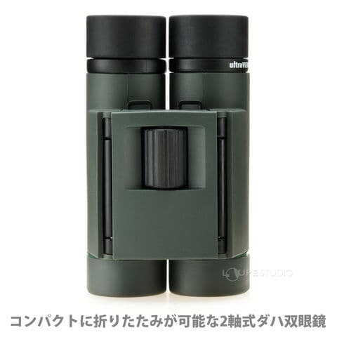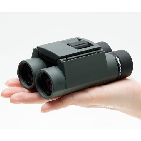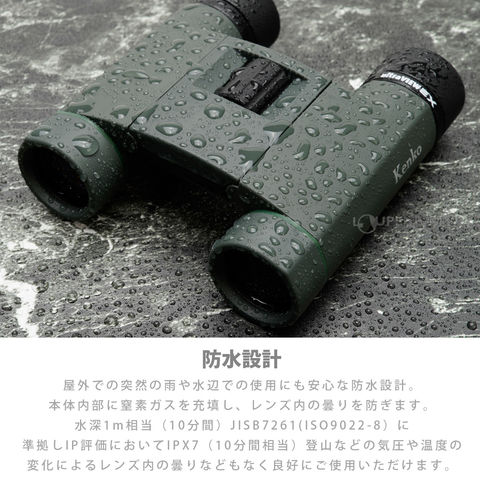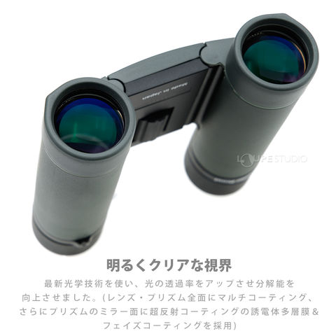 コンパクトに折りたたみが可能な2軸式ダハ双眼鏡。光学系は、ダハプリズムにフェイズコード、補助プリズムには超高反射コーティングの誘電体多層膜を施し、明るくクリアな視界を実現。ボディは、優れた堅牢性を持つアルミダイキャストボディーに外装はラバーで握りやすく、アウトドアシーンでも安心してご使用いただけます。また防水設計となっていますので、気圧や温度差にも強く、レンズ内の曇りもなく登山などでも良好にご使用いただけます。
