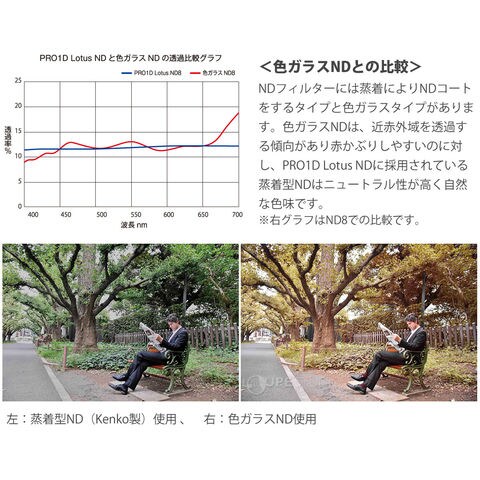 - 撥水・撥油機能を持ちながらも、トップレベルの安定した色再現性で減光します。長時間露光により滝を白糸のように表現するときなど、水しぶきが飛ぶような撮影シーンで特に威力を発揮します。