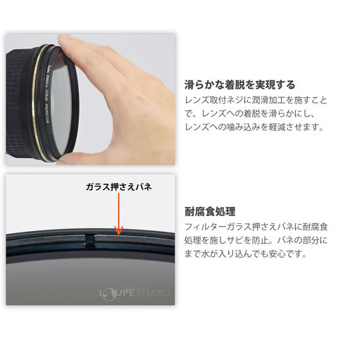 - PRO1D Lotus(ロータス) NDは耐久性に優れた撥水・撥油コーティングを施した高品質減光フィルター。水や汚れを強力に弾き、汚れても簡単に拭き取ることができます。