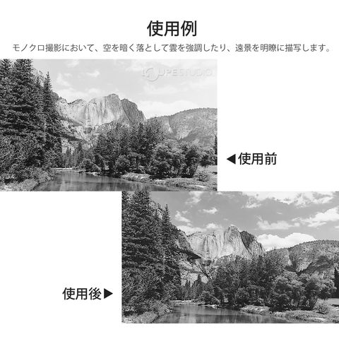 モノクロフィルムでの撮影だけでなく、デジタルカメラのモノクロ写真モードや、画像処理ソフトを使用したモノクロ写真の作成にも使用可能。モノクロ効果はカメラによって異なる場合があります。