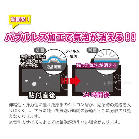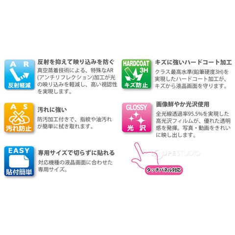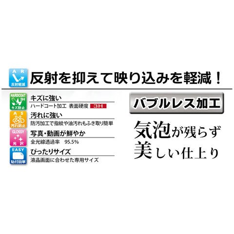 伸縮性・弾力性に優れた特殊なシリコン吸着層が、貼る際に気泡を入りにくくし、残った気泡も時間と共に分散され見えなくなります。真空蒸着技術による特殊な多層膜を施したAR(アンチリフレクション)コートが高い光反射防止性能と視認性を発揮。さらにクラス最高水準(鉛筆硬度3H)を実現したハードコート加工がキズから液晶画面を守ります。また、防汚加工でフィルム表面に汚れが付きにくく、指紋や皮脂汚れなども簡単に拭き取れます。