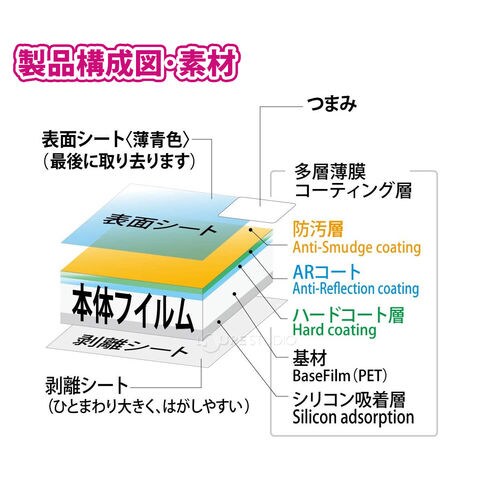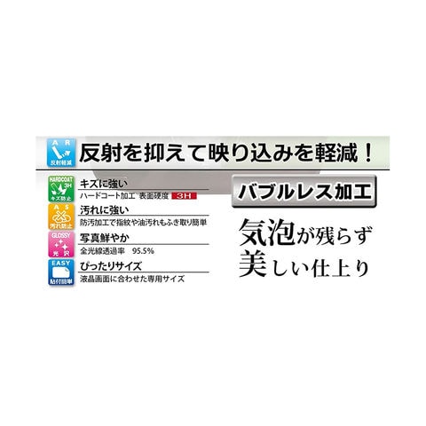 伸縮性・弾力性に優れた特殊なシリコン吸着層が、貼る際に気泡を入りにくくし、残った気泡も時間と共に分散され見えなくなります。真空蒸着技術による特殊な多層膜を施したAR(アンチリフレクション)コートが高い光反射防止性能と視認性を発揮。さらにクラス最高水準(鉛筆硬度3H)を実現したハードコート加工がキズから液晶画面を守ります。また、防汚加工でフィルム表面に汚れが付きにくく、指紋や皮脂汚れなども簡単に拭き取れます。