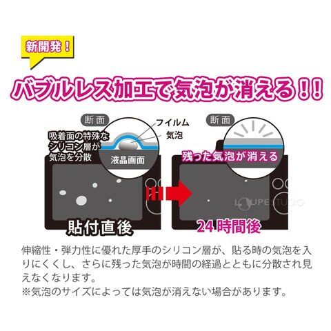 伸縮性・弾力性に優れた特殊なシリコン吸着層が、貼る際に気泡を入りにくくし、残った気泡も時間と共に分散され見えなくなります。真空蒸着技術による特殊な多層膜を施したAR(アンチリフレクション)コートが高い光反射防止性能と視認性を発揮。さらにクラス最高水準(鉛筆硬度3H)を実現したハードコート加工がキズから液晶画面を守ります。また、防汚加工でフィルム表面に汚れが付きにくく、指紋や皮脂汚れなども簡単に拭き取れます。