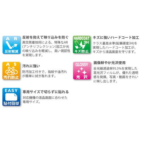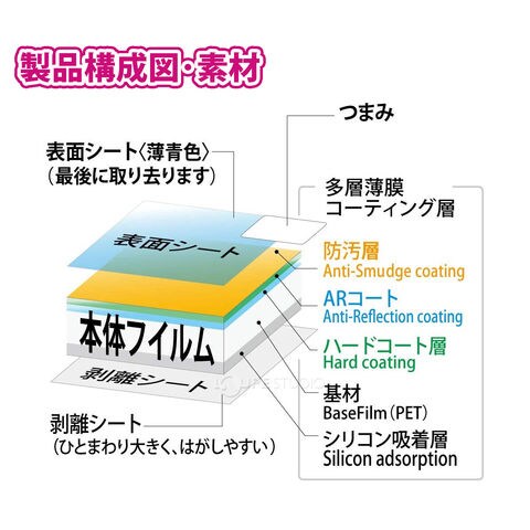 伸縮性・弾力性に優れた特殊なシリコン吸着層が、貼る際に気泡を入りにくくし、残った気泡も時間と共に分散され見えなくなります。真空蒸着技術による特殊な多層膜を施したAR(アンチリフレクション)コートが高い光反射防止性能と視認性を発揮。さらにクラス最高水準(鉛筆硬度3H)を実現したハードコート加工がキズから液晶画面を守ります。また、防汚加工でフィルム表面に汚れが付きにくく、指紋や皮脂汚れなども簡単に拭き取れます。