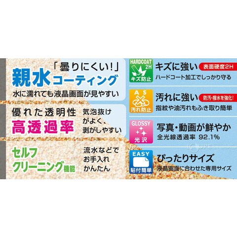 液晶画面を守る〈デジカメ用高性能保護フィルム 液晶プロテクター〉に親水コーティングを施した「防水カメラ用」が登場。液晶画面をキズ・汚れなどからしっかり守りながら、曇りにくく、水に濡れた際の見やすさを実現しました。また、皮脂などの汚れを水が浮き上がらせる「セルフクリーニング機能」つきで、流氷などで簡単にお手入れが可能です。