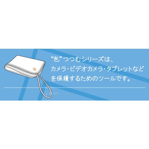 「包(つつむ) ラップクッション」は、カメラやタブレットを包んでゴム留めするだけで、機材をキズや汚れから保護できる手軽で便利なグッズです。隅の三角の生地にクリーニングクロスで使われる生地を採用しているため、液晶画面や機材のお手入れなどにもお使いいただけます。従来のモデルより薄手の生地を採用し、すっきりとスリム化。かさばらず、スマートに機材を包むことができるようになりました。