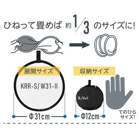 「Kenko Rレフ」はねじって折りたたむと約1/3のサイズになるのでポーチやコンパクトなバッグにも収納することが出来ます。また直径31cmと取り回しに優れるため、細かい反射確度の調整ができ、物撮りなどの撮影にも適しています。